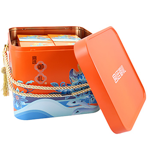這款方形紅蓋手提蛋卷錦繡華禮盒鐵盒的尺寸為235*235*210mm,為了順應(yīng)多樣化的市場包裝需求,這款茶葉馬口鐵盒可做成心形、正方形、橢圓形、車形、書本形等異形造型。