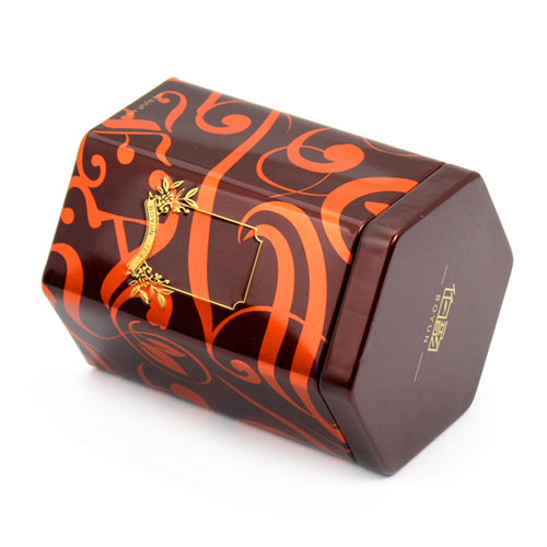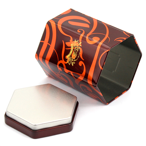 這款六邊形通用馬口茶葉鐵罐的尺寸為90*80*105mm,為了順應多樣化的市場包裝需求,這款糖果馬口鐵罐可做成心形、正方形、橢圓形、車形、書本形等異形造型