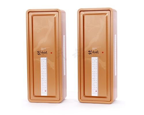 在外觀印刷制作工藝上,選用了(金色)+四色的印刷工藝制作,為了防止鐵罐的印面易于劃花,在外表面涂布了水性的光油,內部也過上金油涂料,目的為了更好地保證了茶葉的食品安全。此款茶葉鐵罐可采用雕刻、裱紙、貼鉆等工藝處理。這可讓到鐵罐在外觀效果上更為精美,激發了消費者的購買欲望,讓消費者產生一見鐘情的感覺。