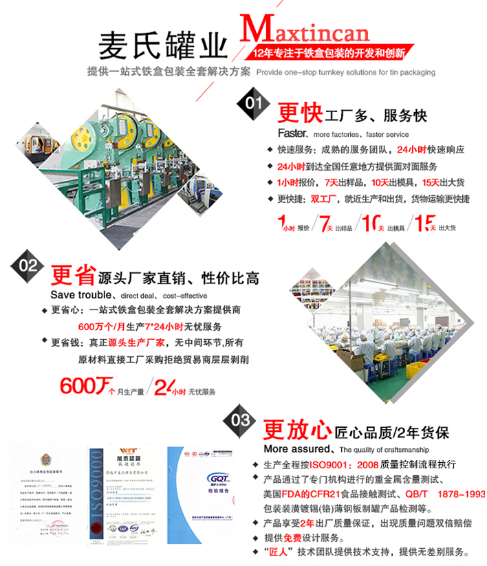 在生產圓形開窗西洋參鐵盒的同時,我司全方位為您提供一站式鐵盒包裝服務,包括提供鐵盒所用的內托、手提、鎖扣、禮品袋、標牌、真空袋、塑膠蓋等配件產品。省時省力為客戶節約鐵盒生產時間,減少生產制作成本。真正做到效率、標準、低成本的鐵盒包裝產品。